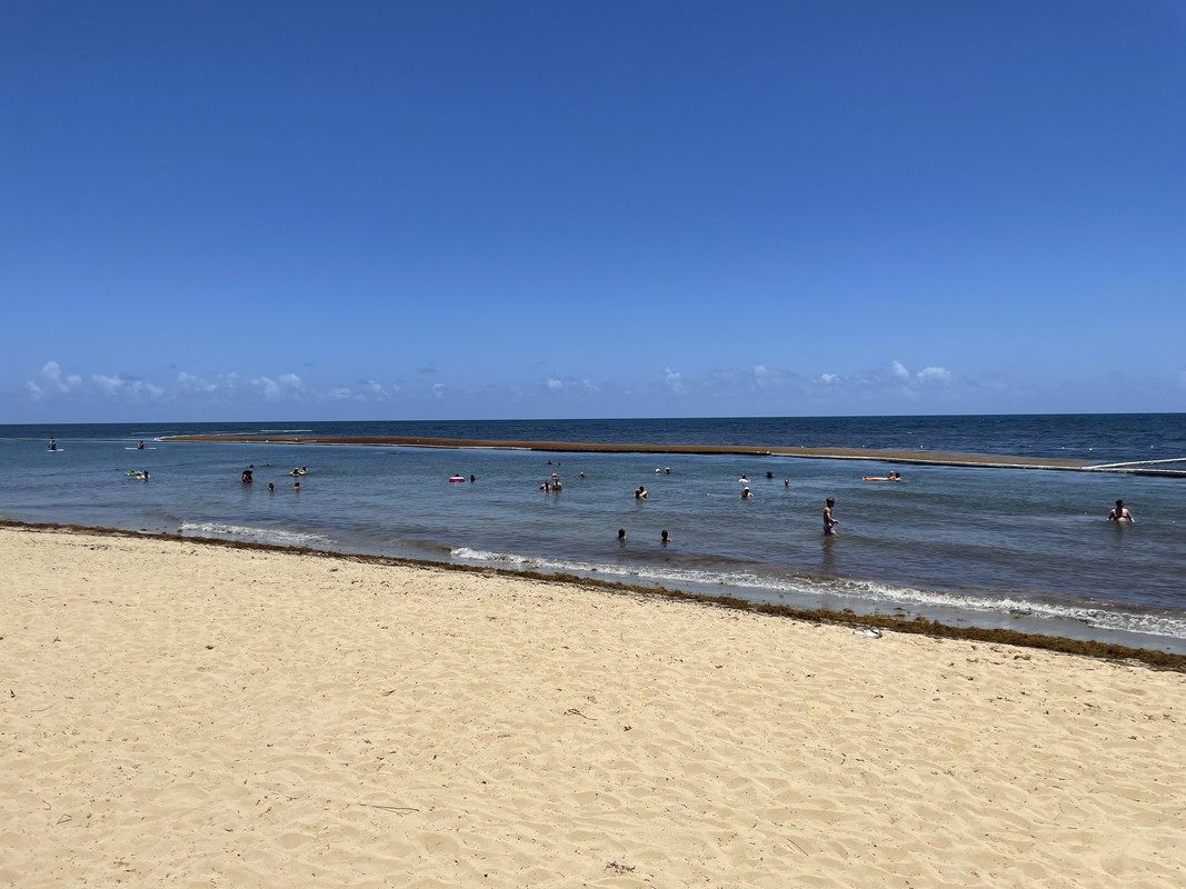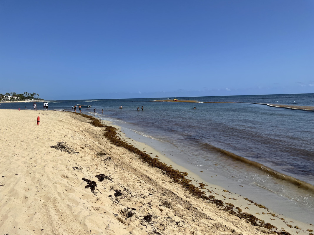 Это восточное побережье, поэтому водоросли. И теперь всё завсисит от резорта - на нашем (Dreams Punta Cana) и парочке соседних они сделали боновое заграждение с сеткой до дна - итого водорослей практически нет. (Вначале - у них были какие-то дыры, и с пляжа убирали тупо бульдозером, но потом видимо починили, там непрерывно 4 человека на бонах сидело). Т.е. купаться можно практически без вопросов. Ну насколько там можно купаться даже весной - это открытое восточное побережье, там непрерывно волнение и в воде песок, так что если кто хочет рассматривать дно и рыб - это не сюда.