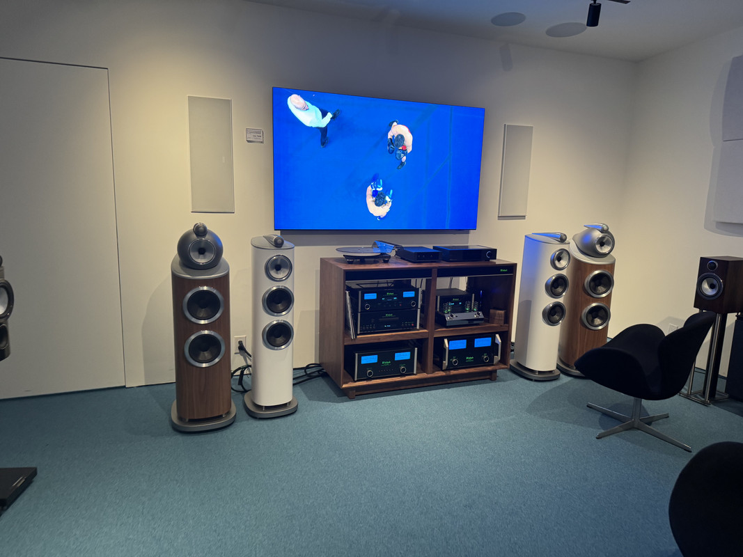 Там если не для начала - вот рядом стоит - эти синенькие индикаторы это макинтоши, они наверное штук по 10 каждый (а может и больше), и ореховые колонки - это Bowers & Wilkins 803 D4 - c$32,000 / pair. (причём бывают ещё 802 D4 и особенно 801 D4 - весом ровно 100кг..)
