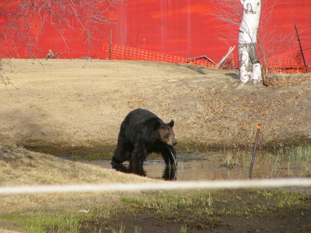 а это Natural Resources Officer пришёл его грохнуть. сам процесс убиения я не снимал, не хочу. я предложил егерю стрельнуть в мишку транквилизатором и спящего отвезти за реку на внешней подвеске в сетке, но егерь сказал, что теперь бесполезно увозить, он унюхал еду, будет всё время приходить снова.