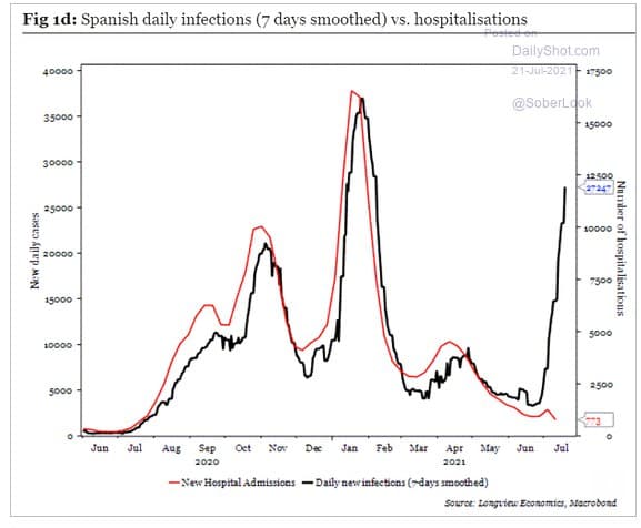 Благодаря вакцинации корреляций заражений и госпитализаций была разрушена в Испании. Пошла даже обратная корреляция судя по графику